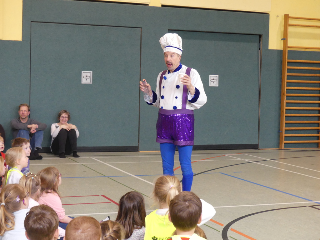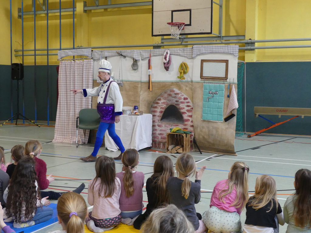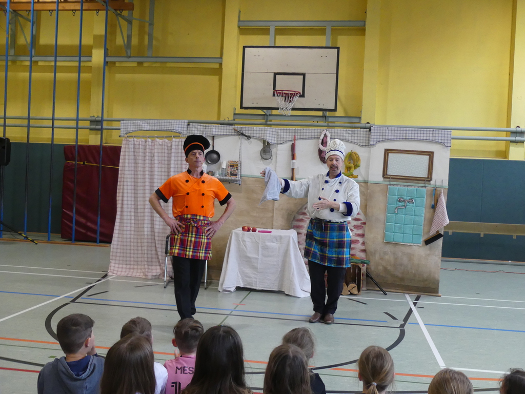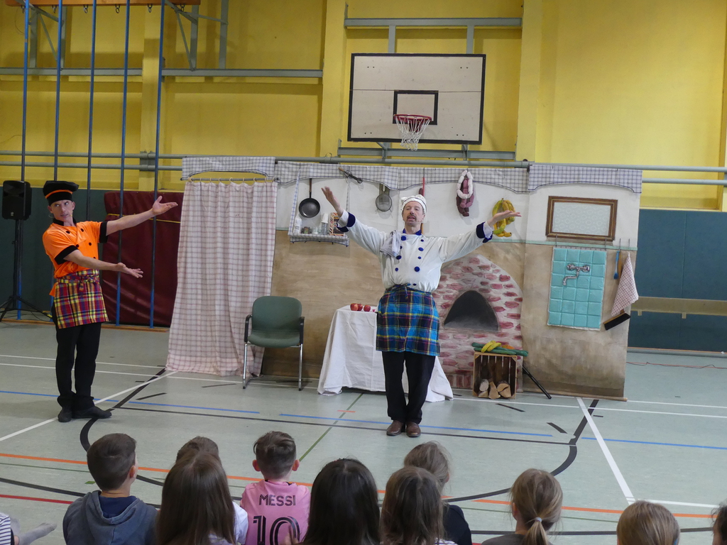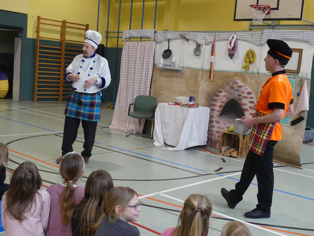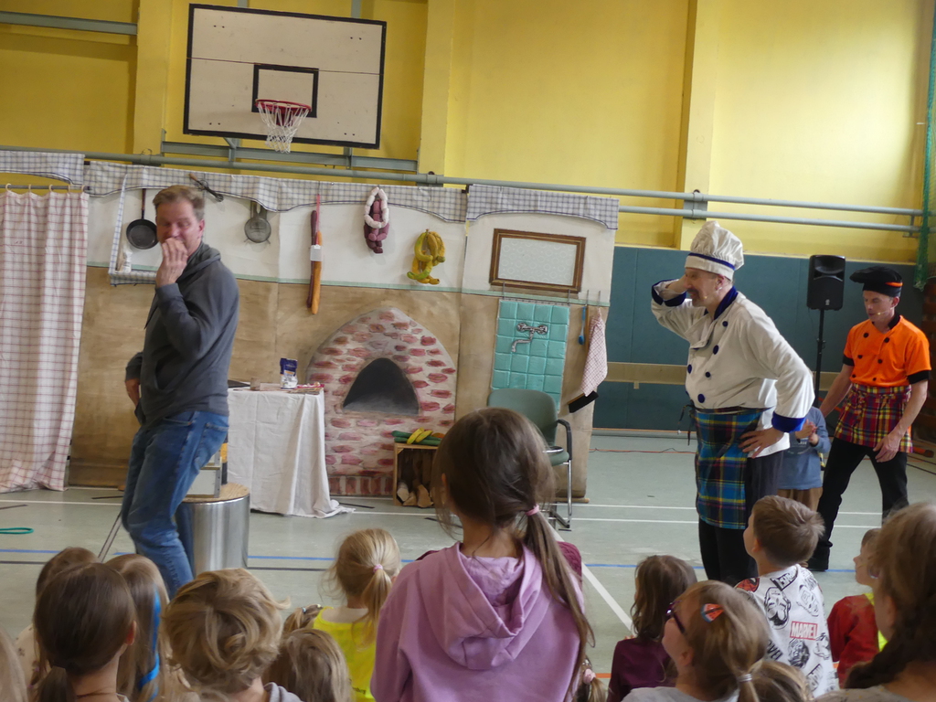 Am Dienstag, 24.3.2026 trat das Theater "Coq au Vin" mit seinem Stück "Der furiose Küchenzirkus" in der Sprothalle der Grundschule Rehfelde auf.