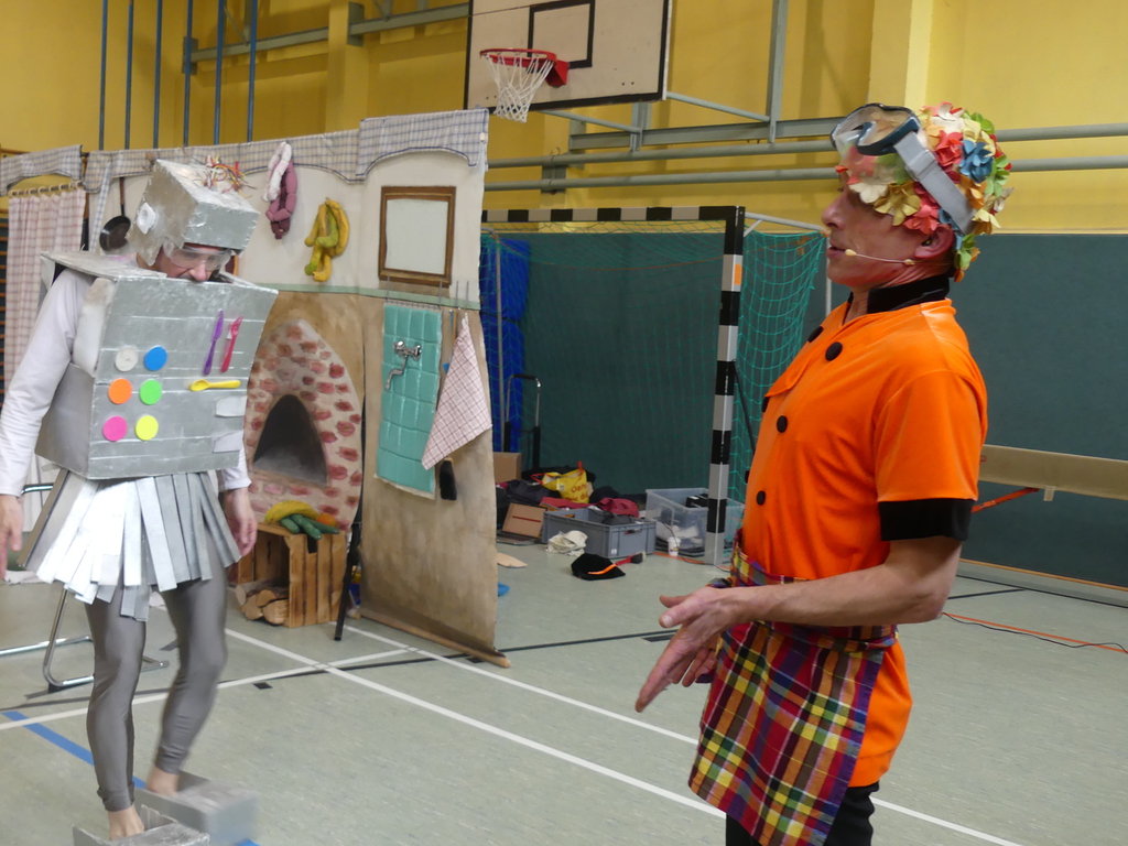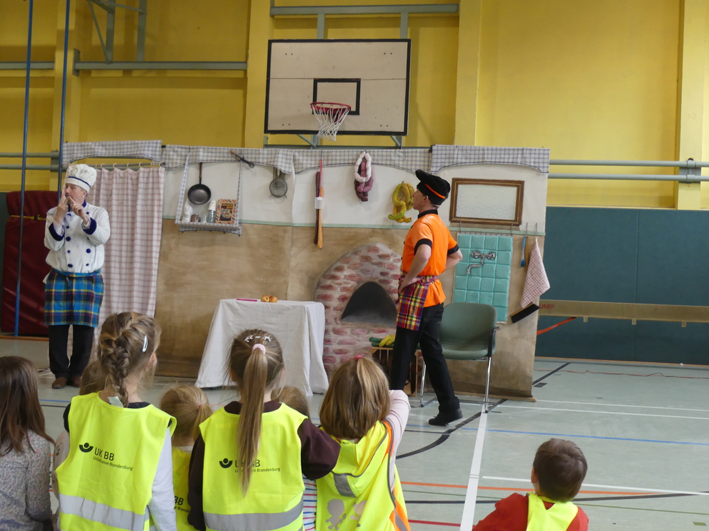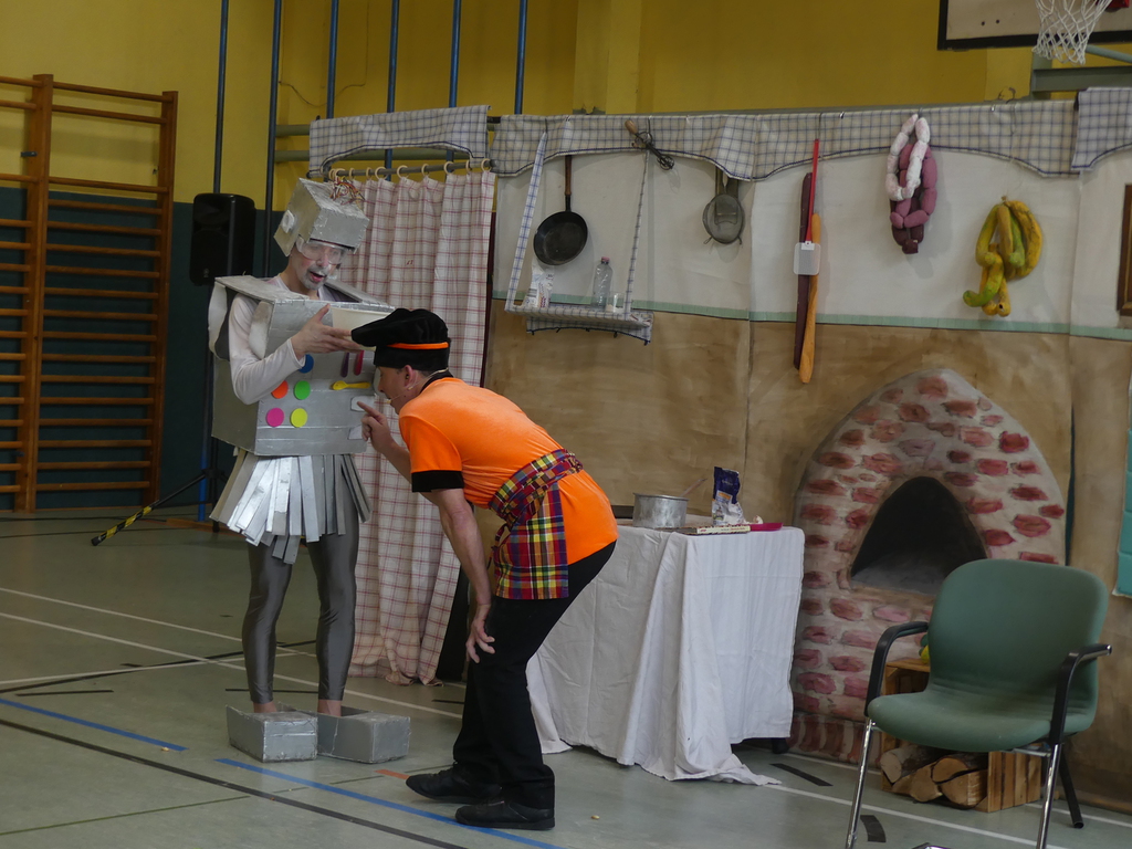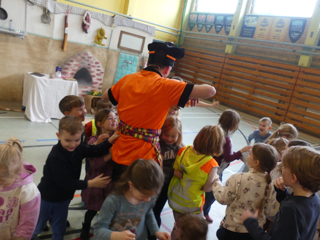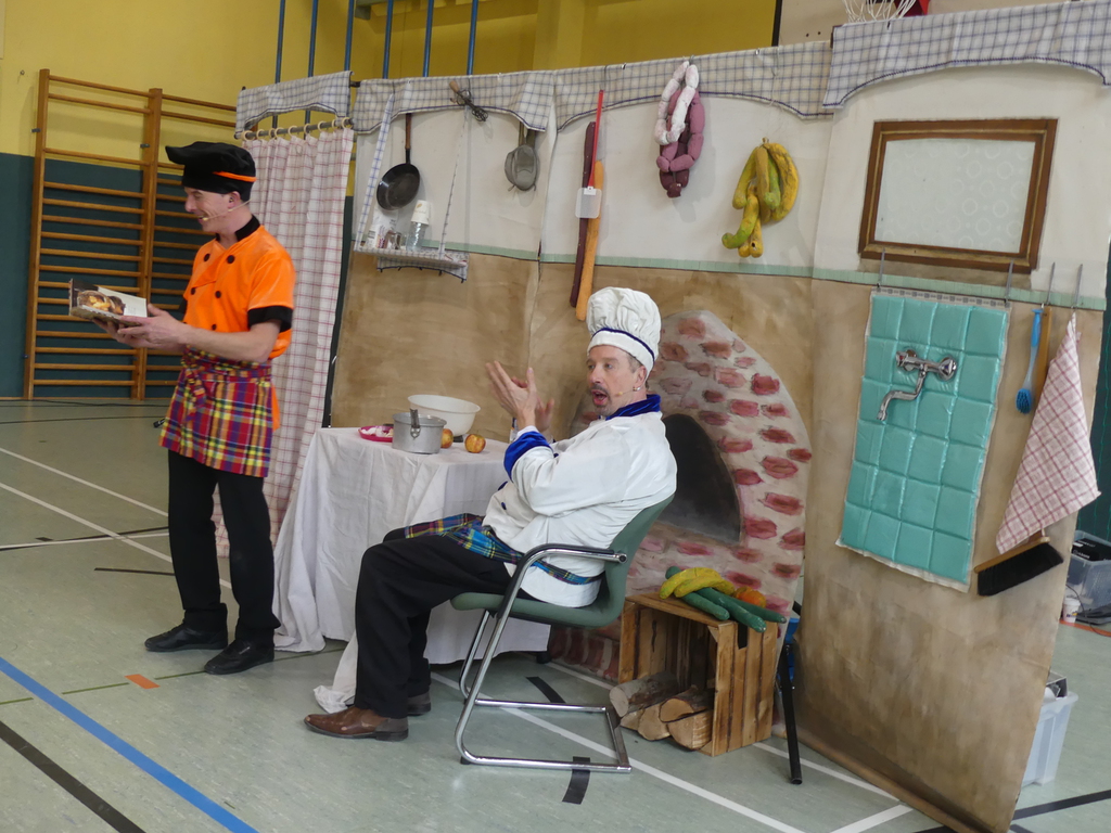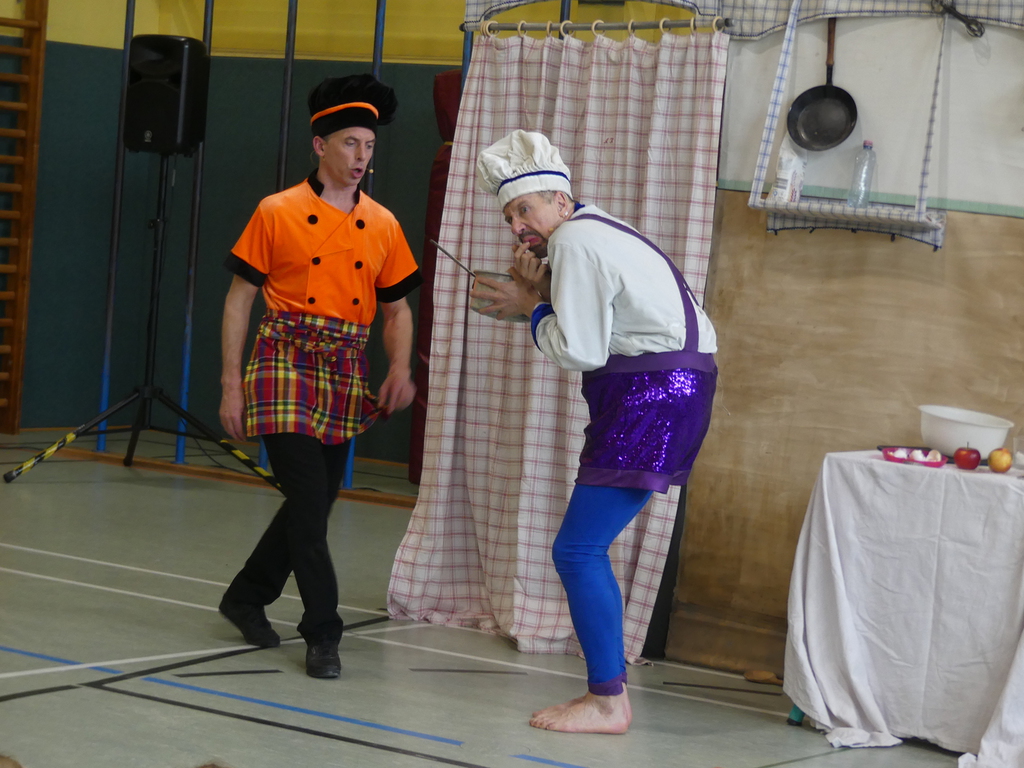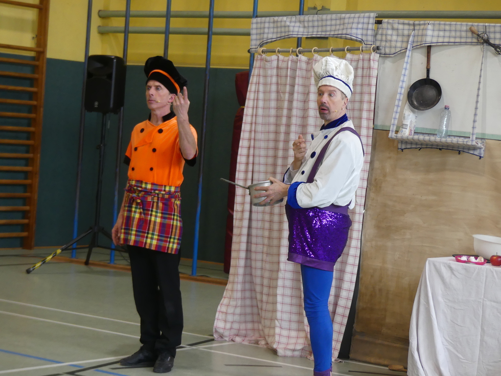 Am Dienstag, 24.3.2026 trat das Theater "Coq au Vin" mit seinem Stück "Der furiose Küchenzirkus" in der Sprothalle der Grundschule Rehfelde auf.