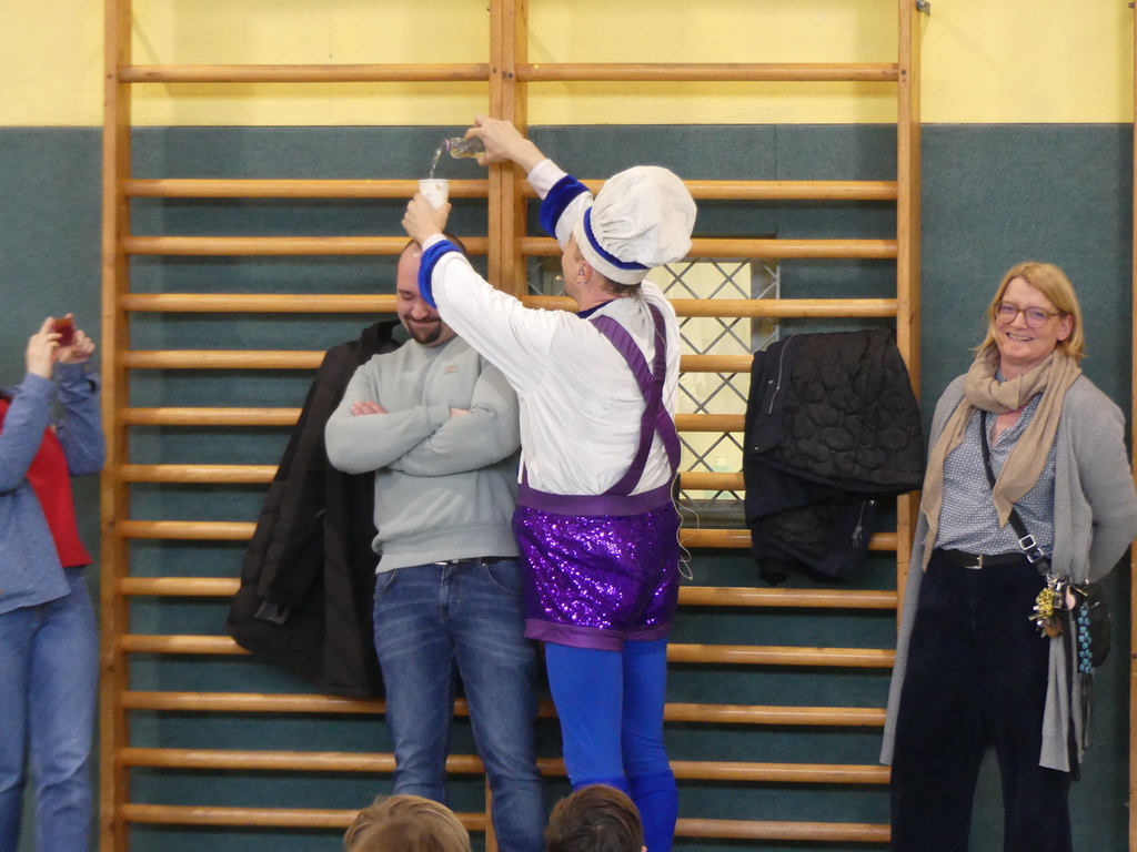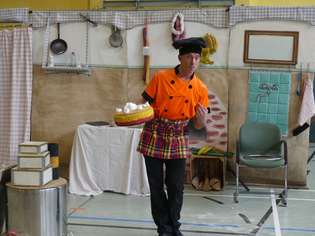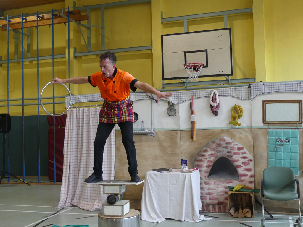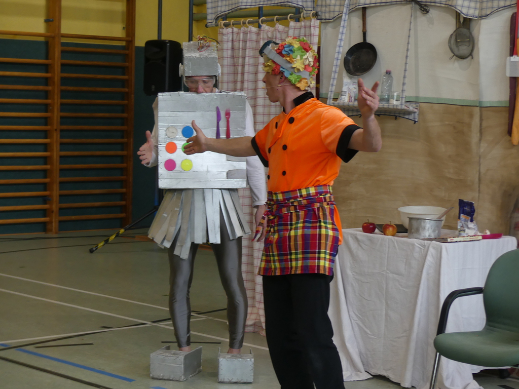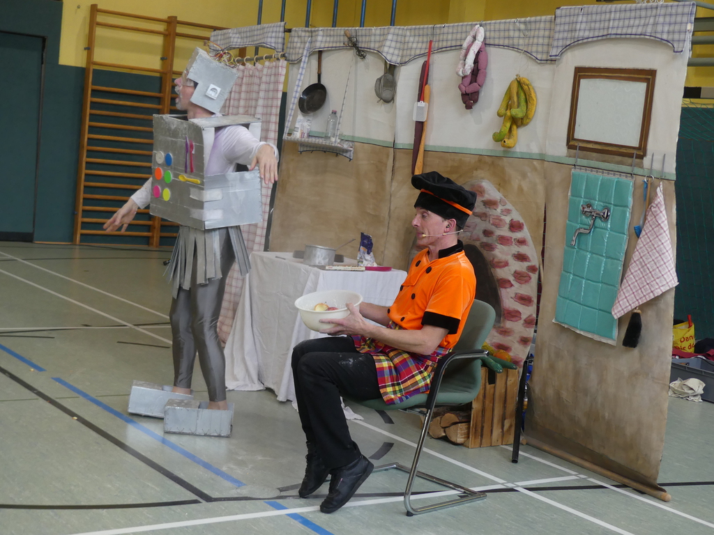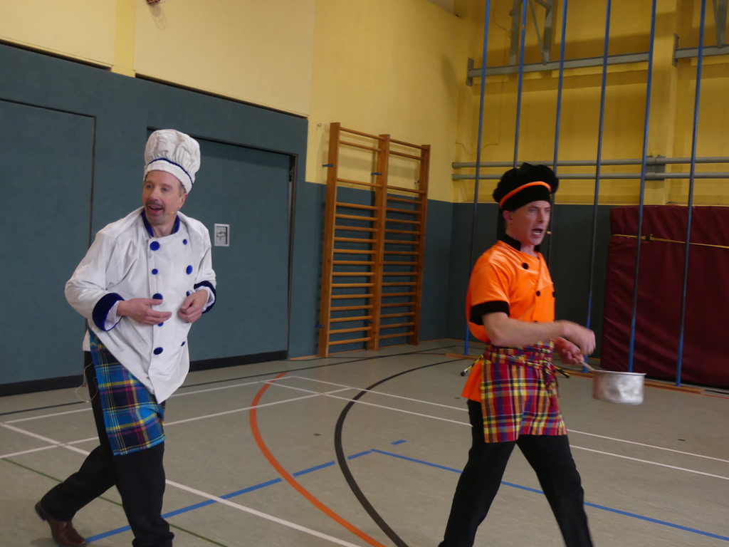 Am Dienstag, 24.3.2026 trat das Theater "Coq au Vin" mit seinem Stück "Der furiose Küchenzirkus" in der Sprothalle der Grundschule Rehfelde auf.