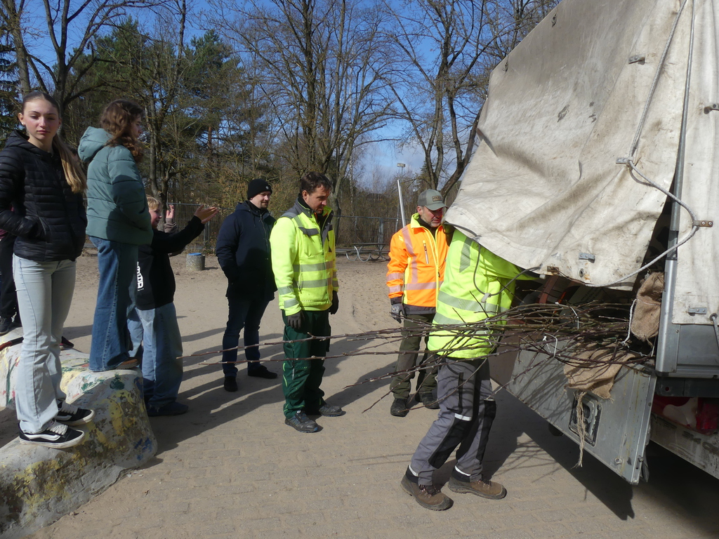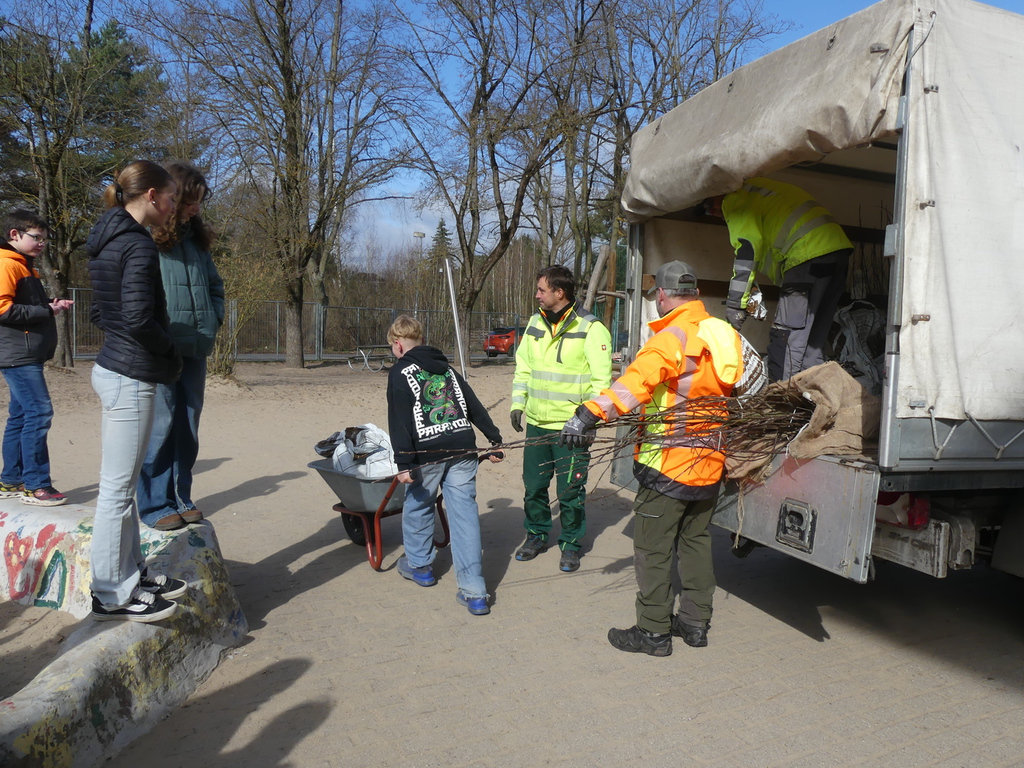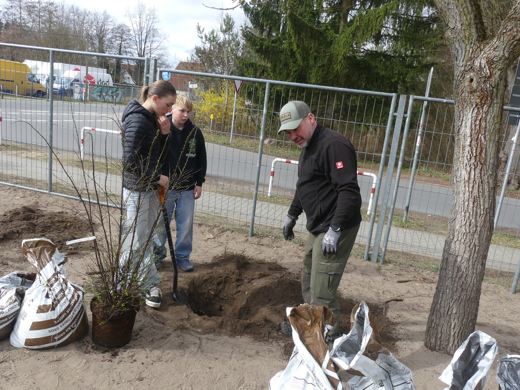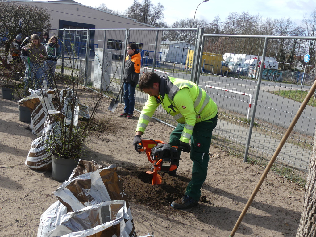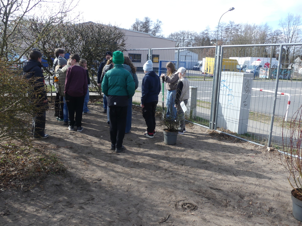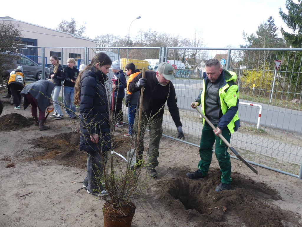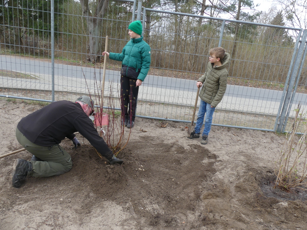 Unter Regie des Amtes Märkische-Schweiz, Herrn Klapproth, pflnazten die Schülerinnen und Schüler der Klasse 6b zwölf einheimische Büsche auf unserem Schulhof.