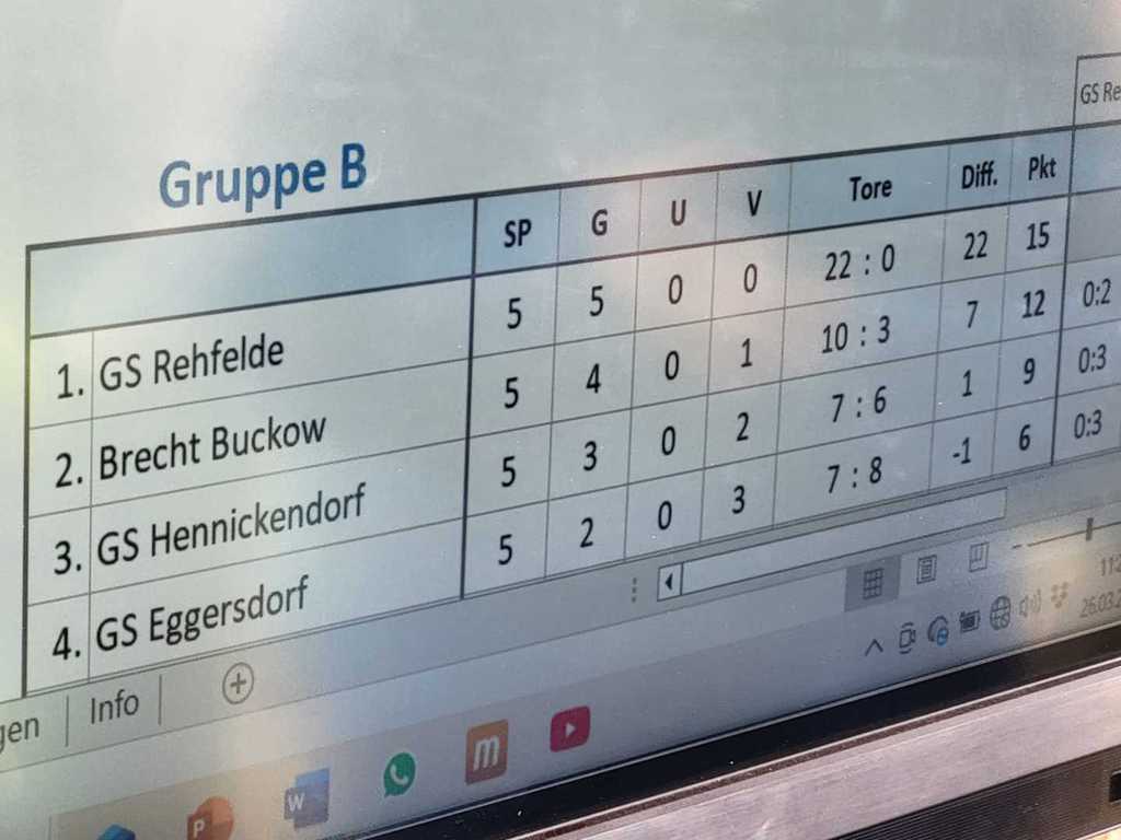 Beim Fußball Kreisfinale 2026 in Strausberg überzeugte unser Team der Grundschule Rehfelde mit einer starken Gesamtleistung. Bereits in der Vorrunde dominierte unsere Mannschaft, angeleitet von Herrn Ackermann, das Geschehen klar: Ohne Gegentor und ohne Punktverlust zog das Team verdient in die Endrunde ein.